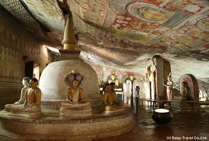 スリランカ最大の石窟寺院。金箔の施された数々の仏像が並びます。荘厳な空気が漂う洞窟内は極彩色の仏画で埋め尽くされおり、人々の篤い信仰心が垣間見られます。